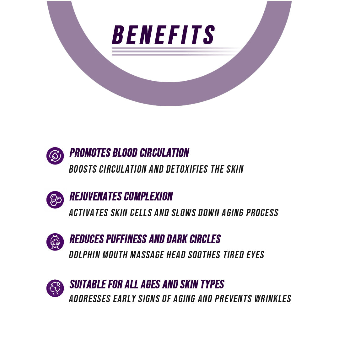 This tool promotes blood circulation, detoxifies your skin, and rejuvenates your complexion. It has three color modes that help reduce wrinkles, shrink pores, and whiten your skin, leaving it smooth, soft, and supple. The dolphin mouth of our tool can be used to massage and soothe tired eyes, reducing puffiness and dark circles.